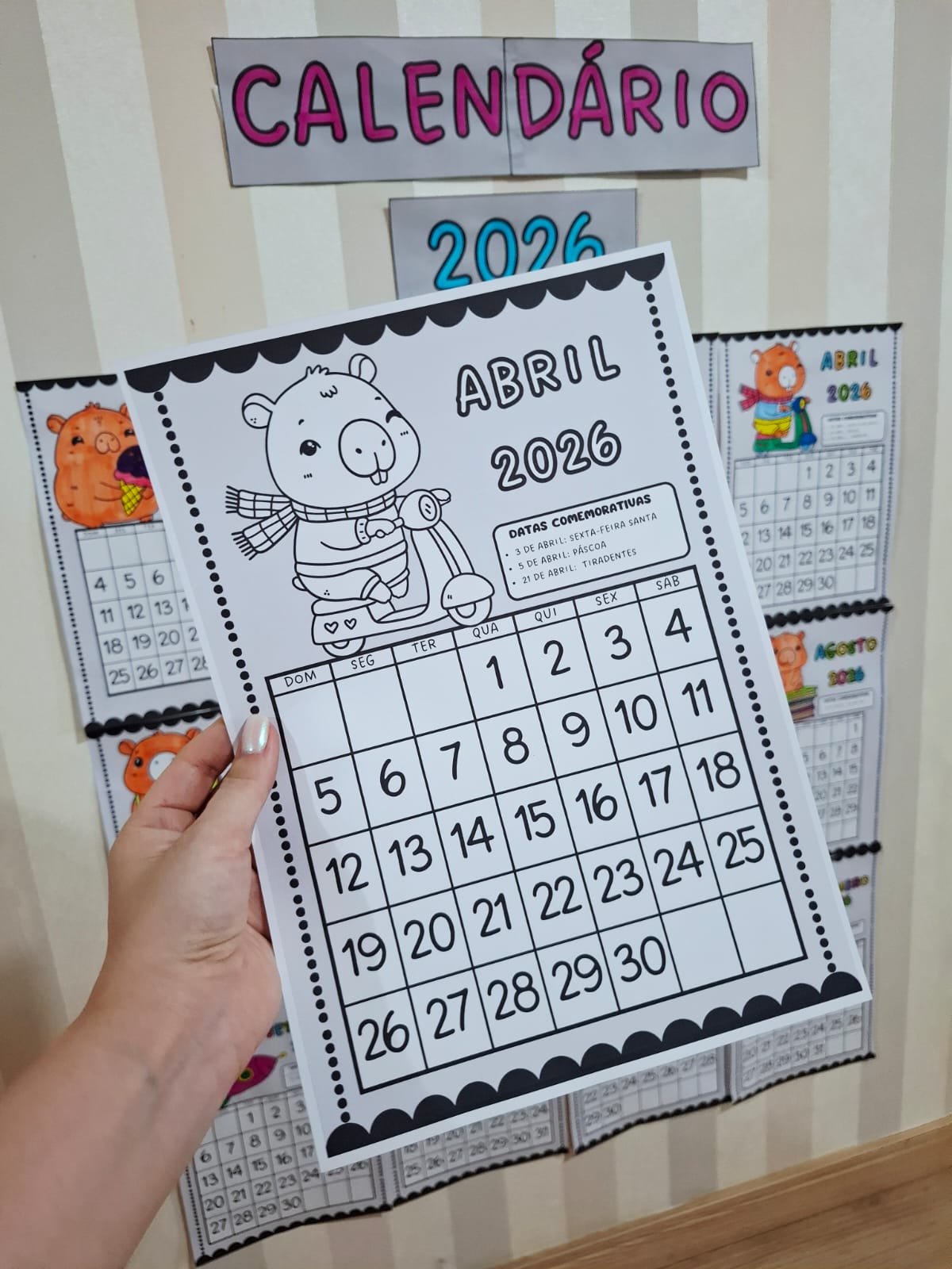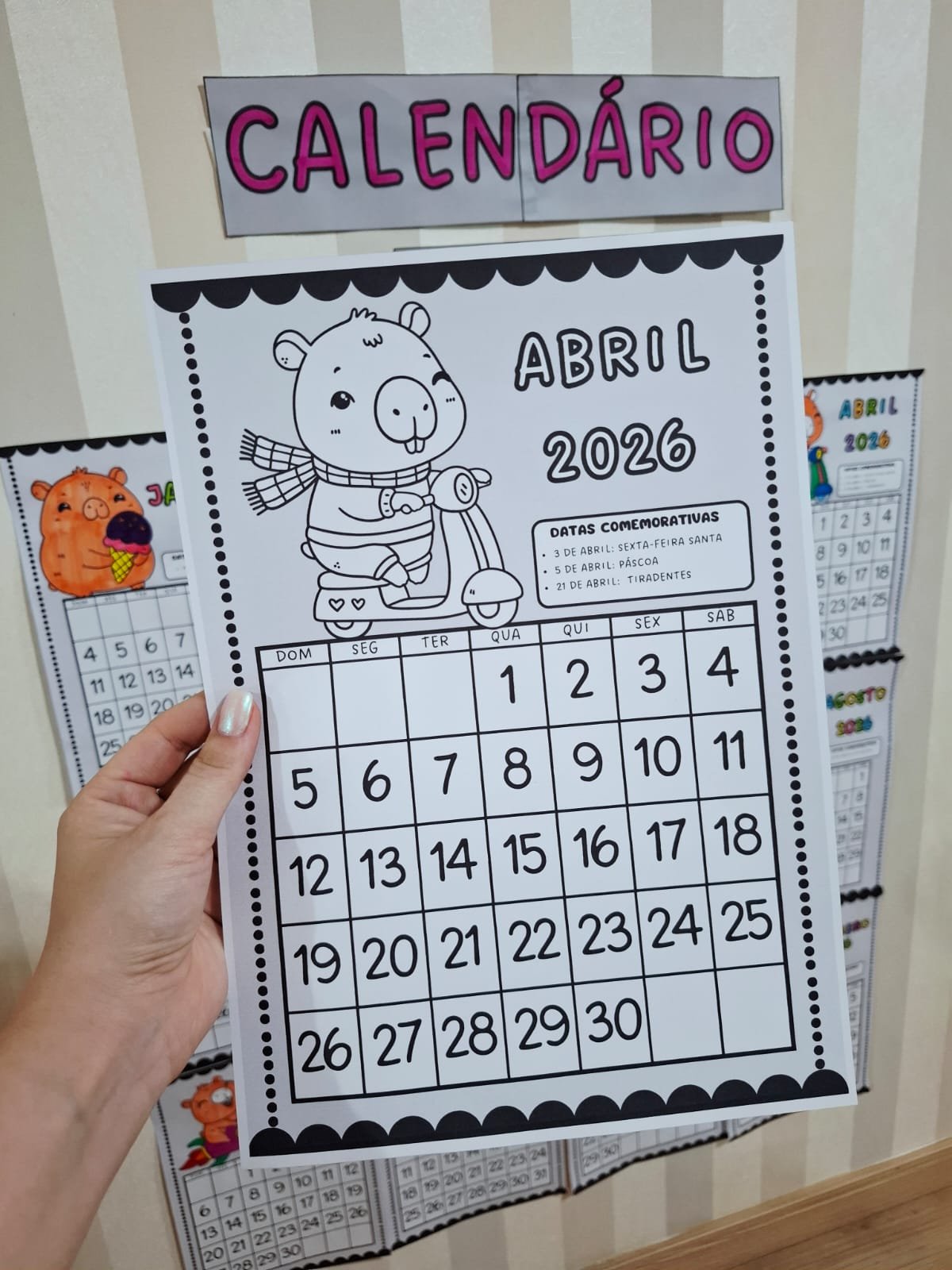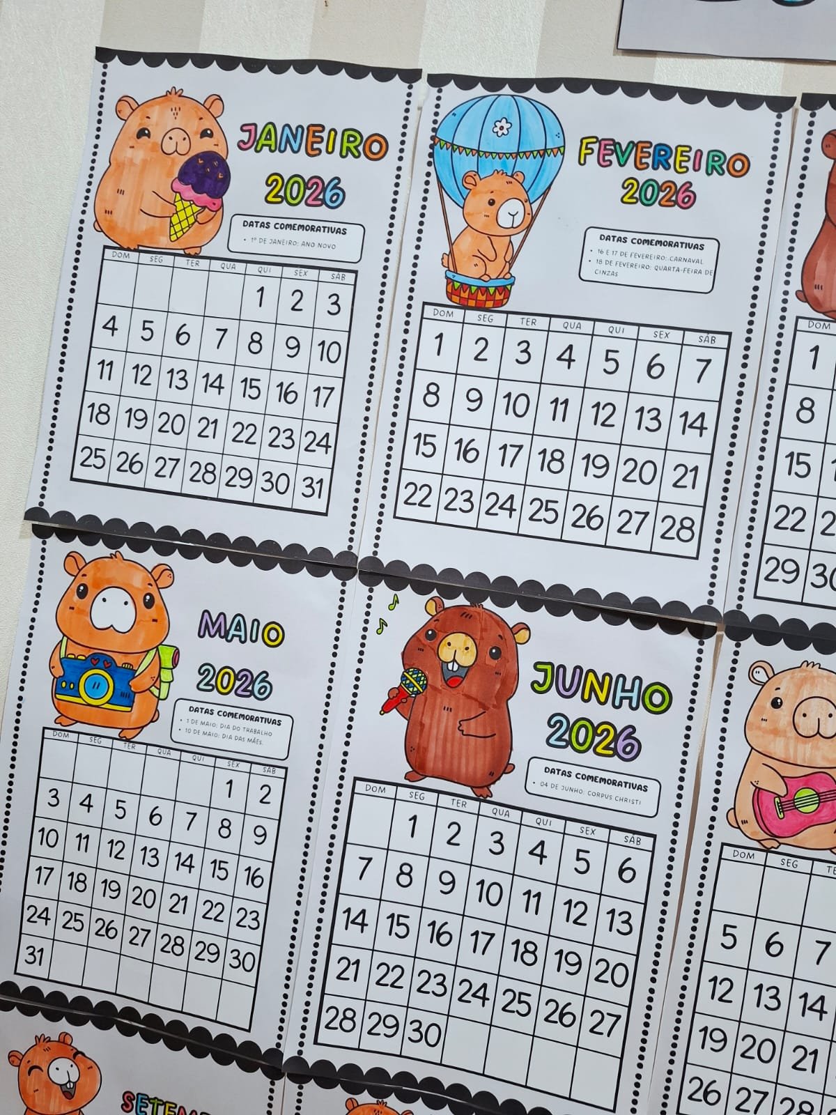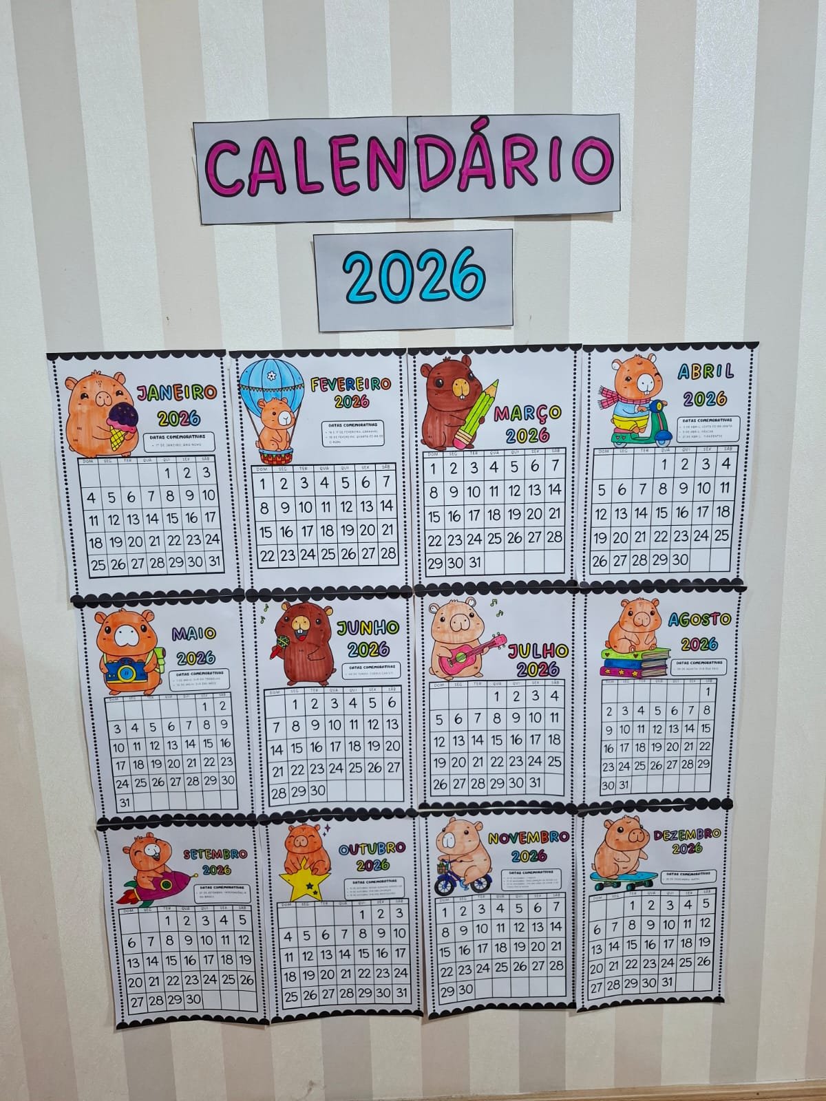 O calendário pode ser apresentado no início do ano letivo, permitindo conversar com a turma sobre os meses, datas importantes e organização do tempo. Em seguida, as crianças participam de um trabalho coletivo, pintando as imagens e montando um mural de parede para a sala.