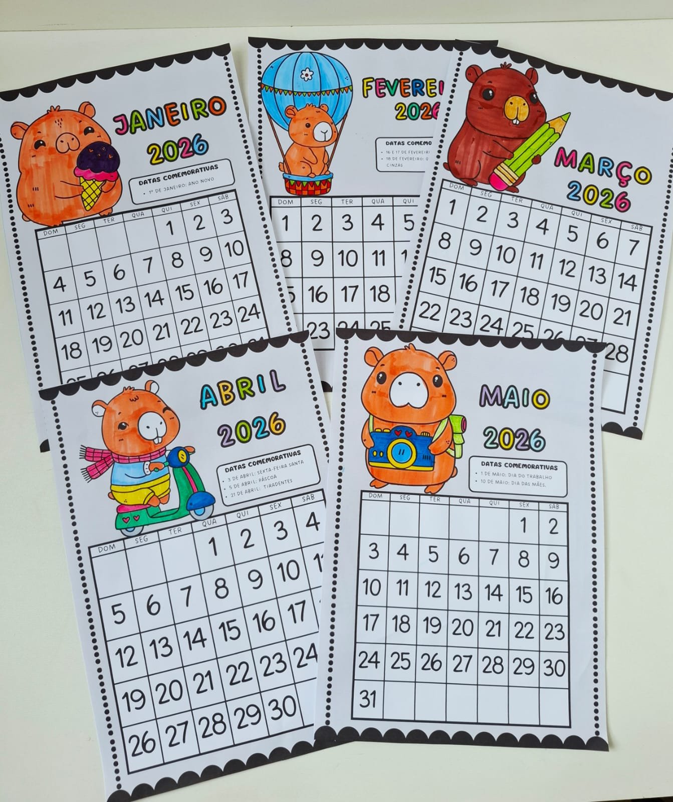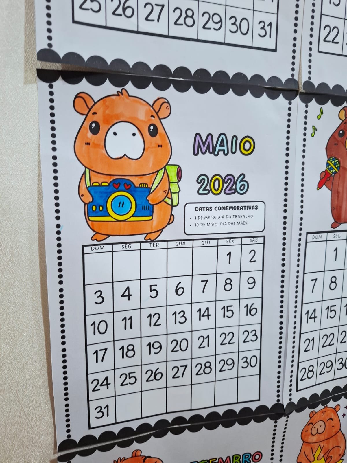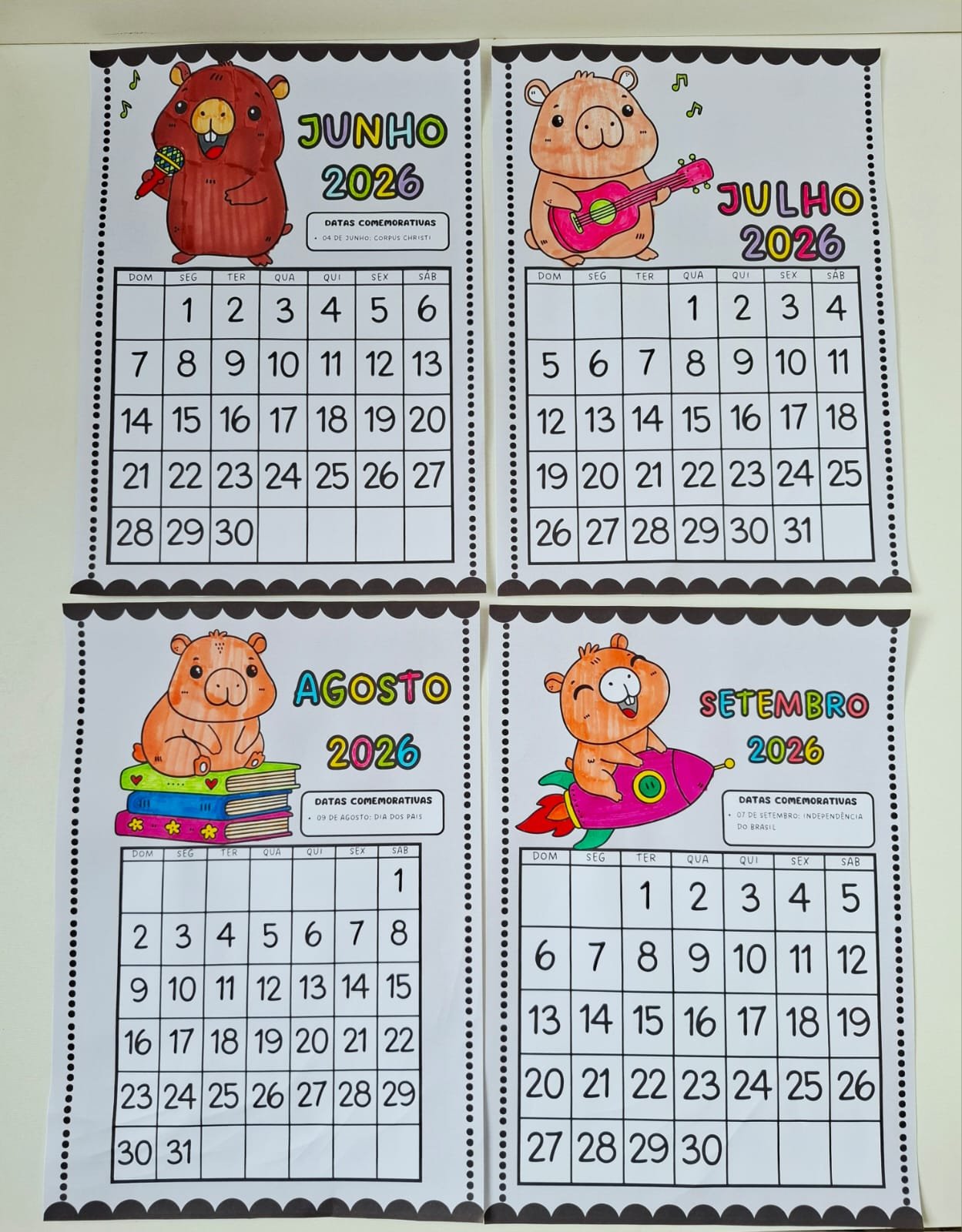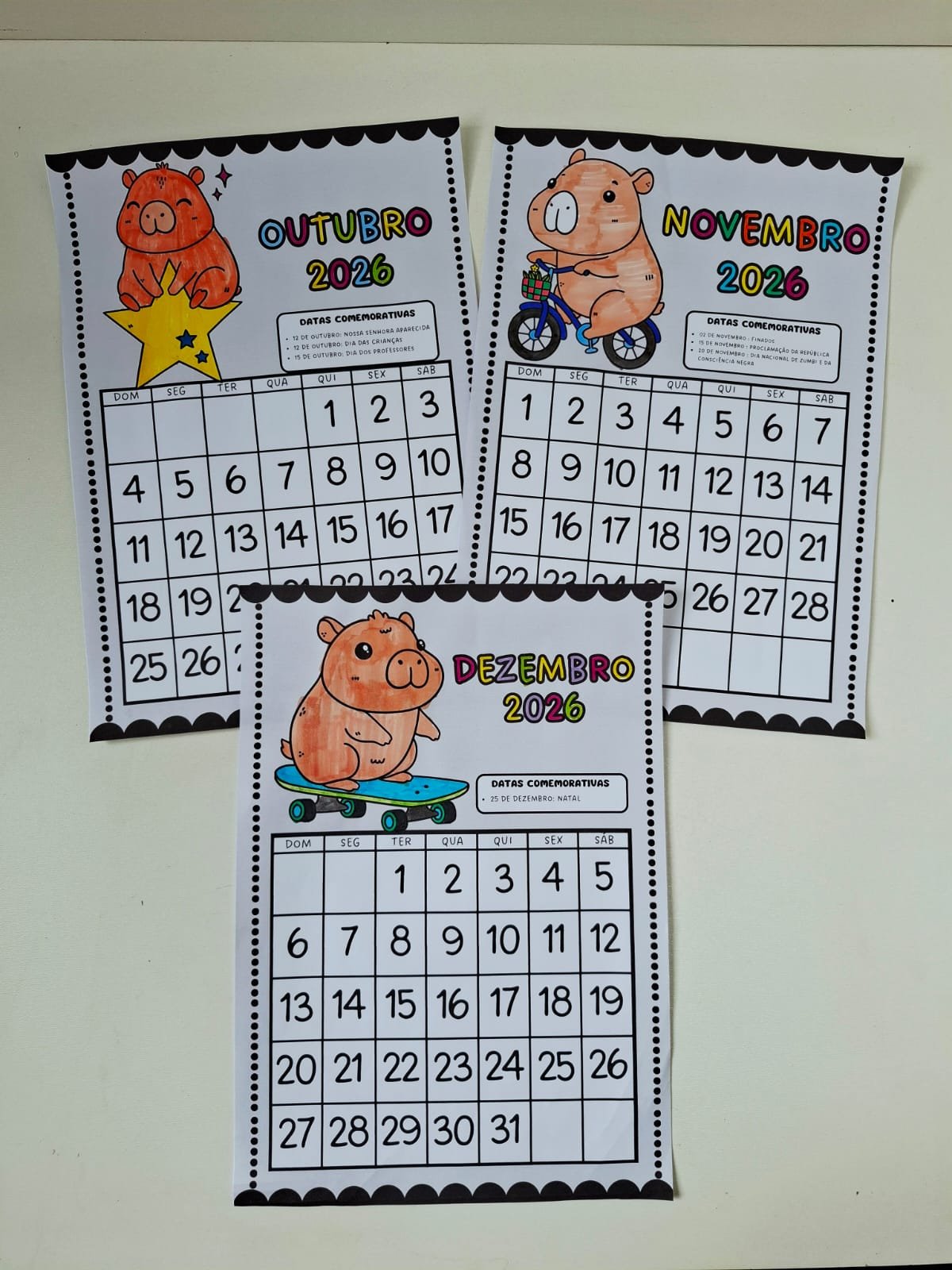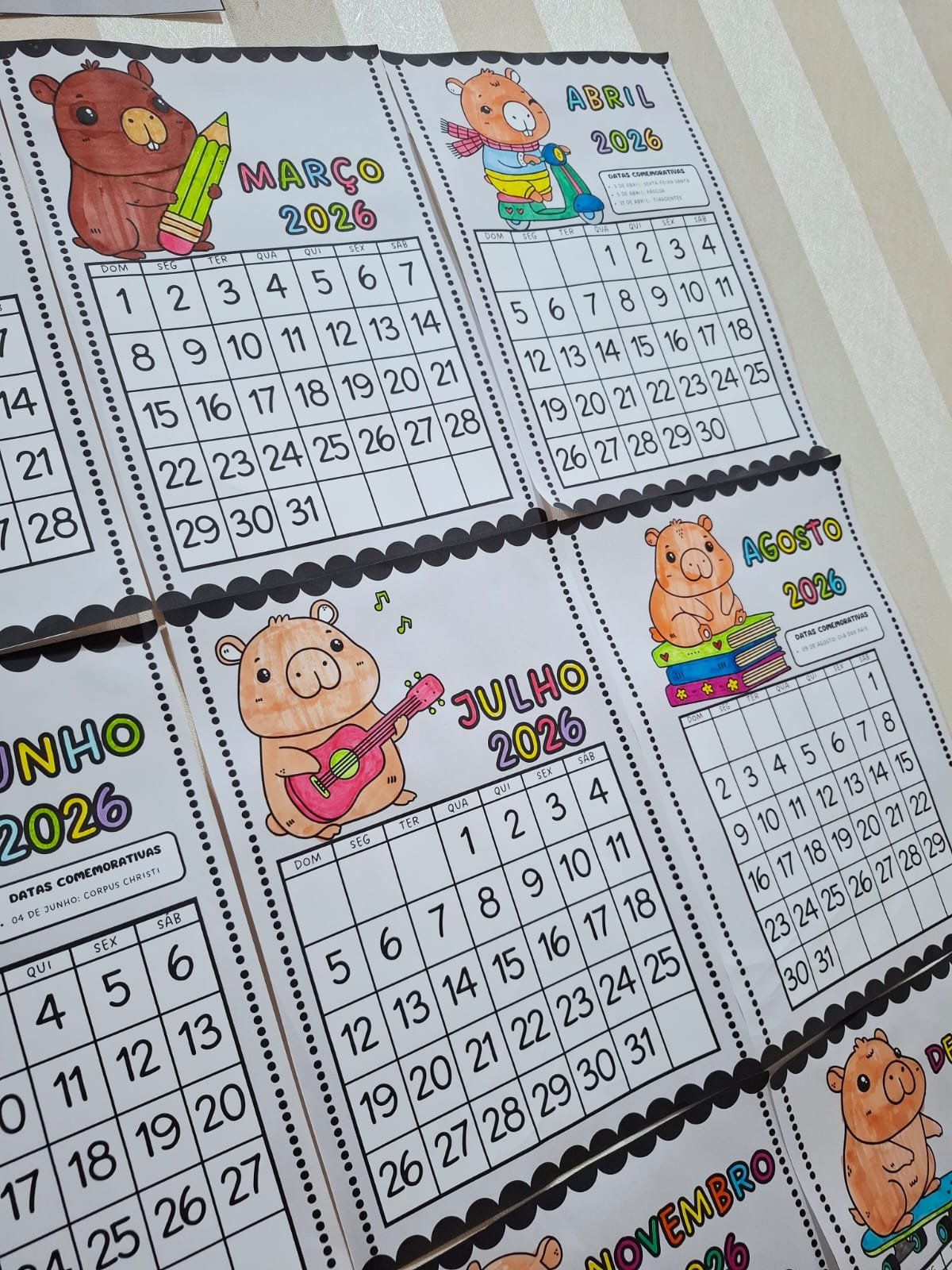 O calendário pode ser apresentado no início do ano letivo, permitindo conversar com a turma sobre os meses, datas importantes e organização do tempo. Em seguida, as crianças participam de um trabalho coletivo, pintando as imagens e montando um mural de parede para a sala.