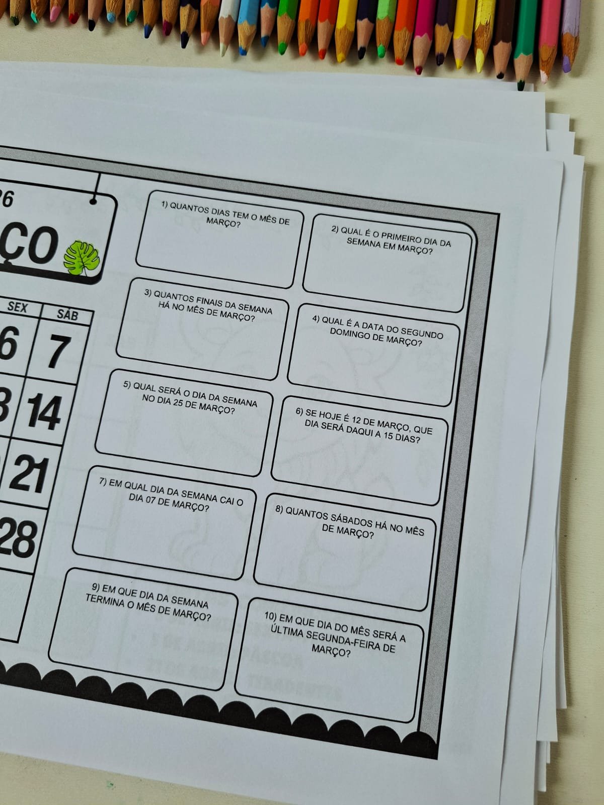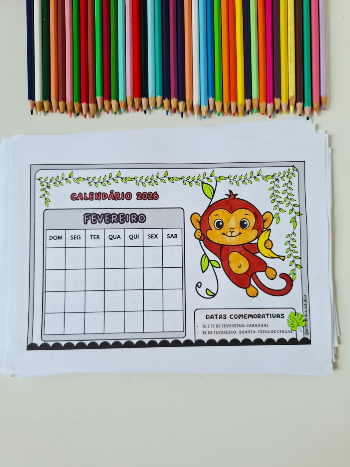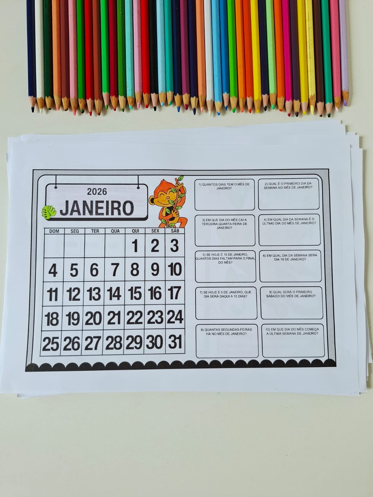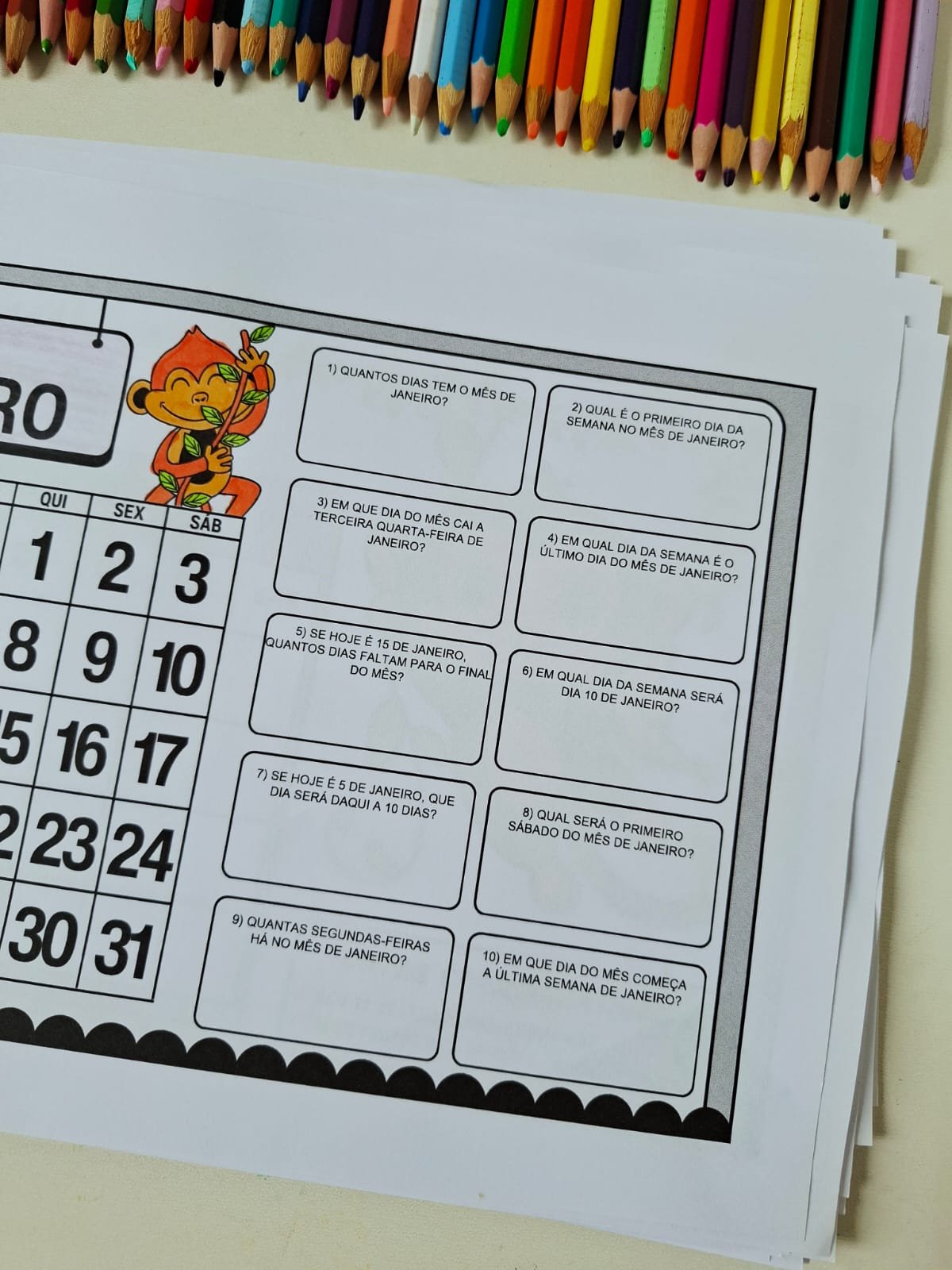 O material propõe que o aluno complete o calendário mensal e, em seguida, realize atividades de análise e interpretação relacionadas a cada mês, favorecendo a compreensão da organização do tempo, dos dias da semana e das datas importantes.