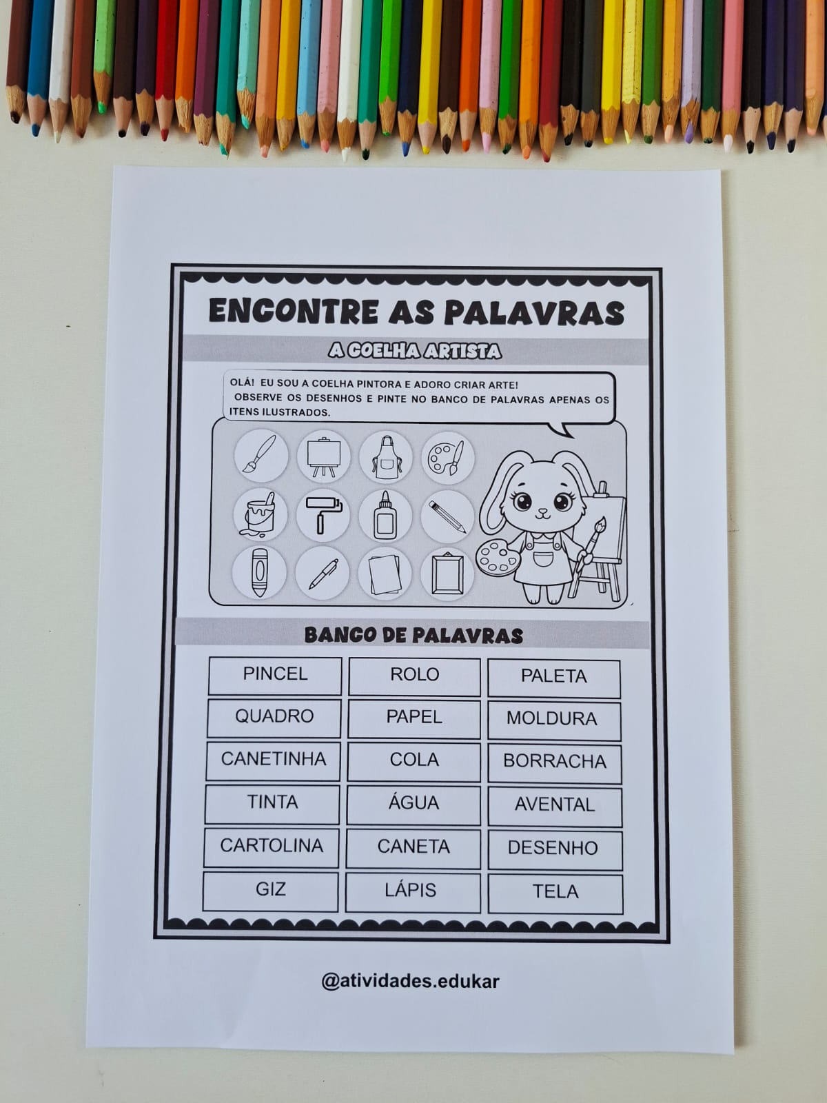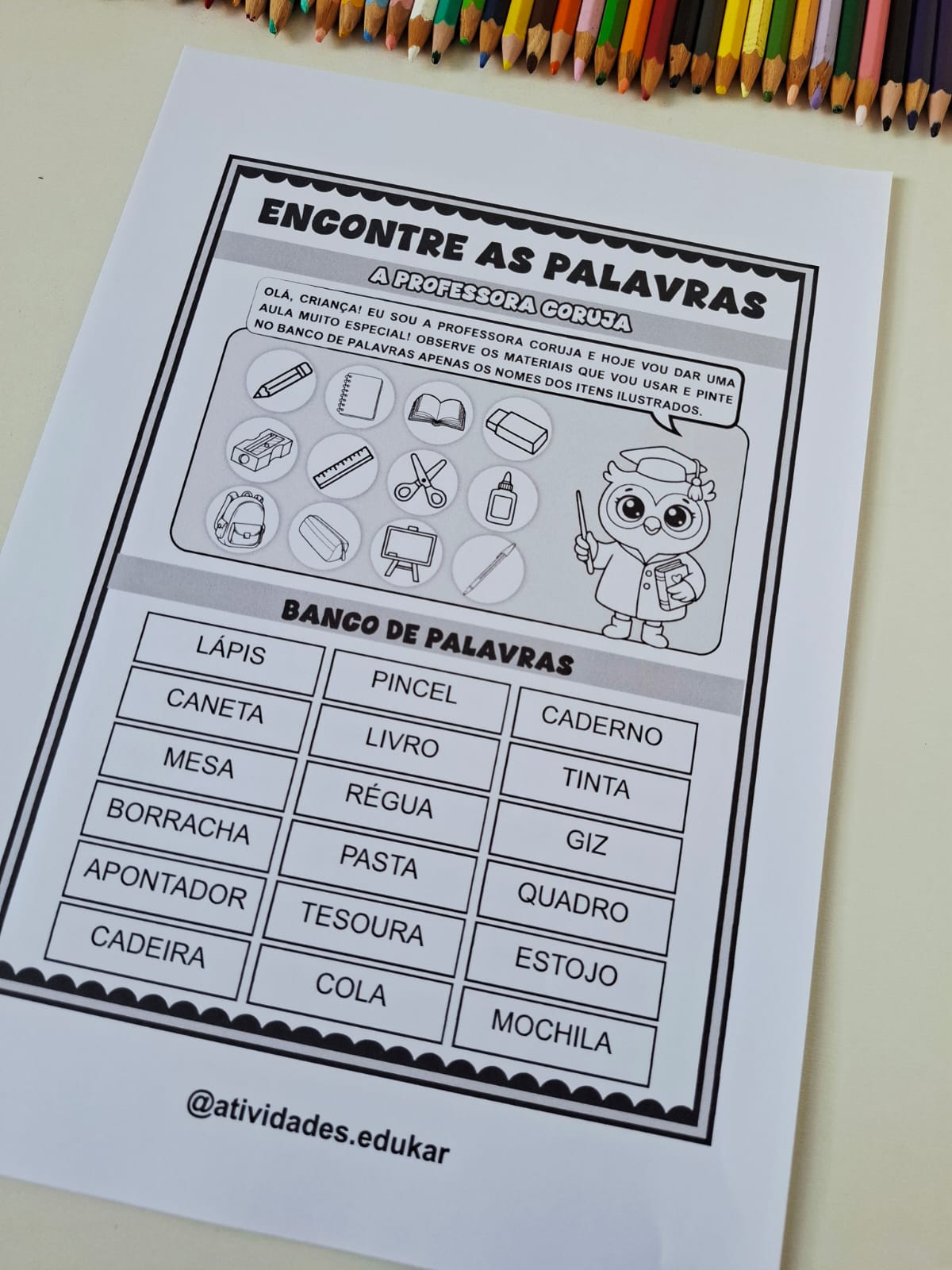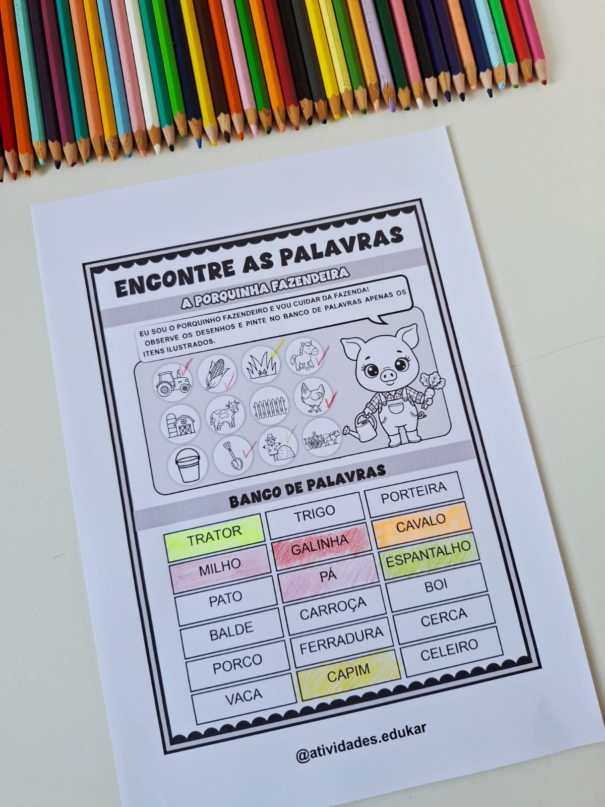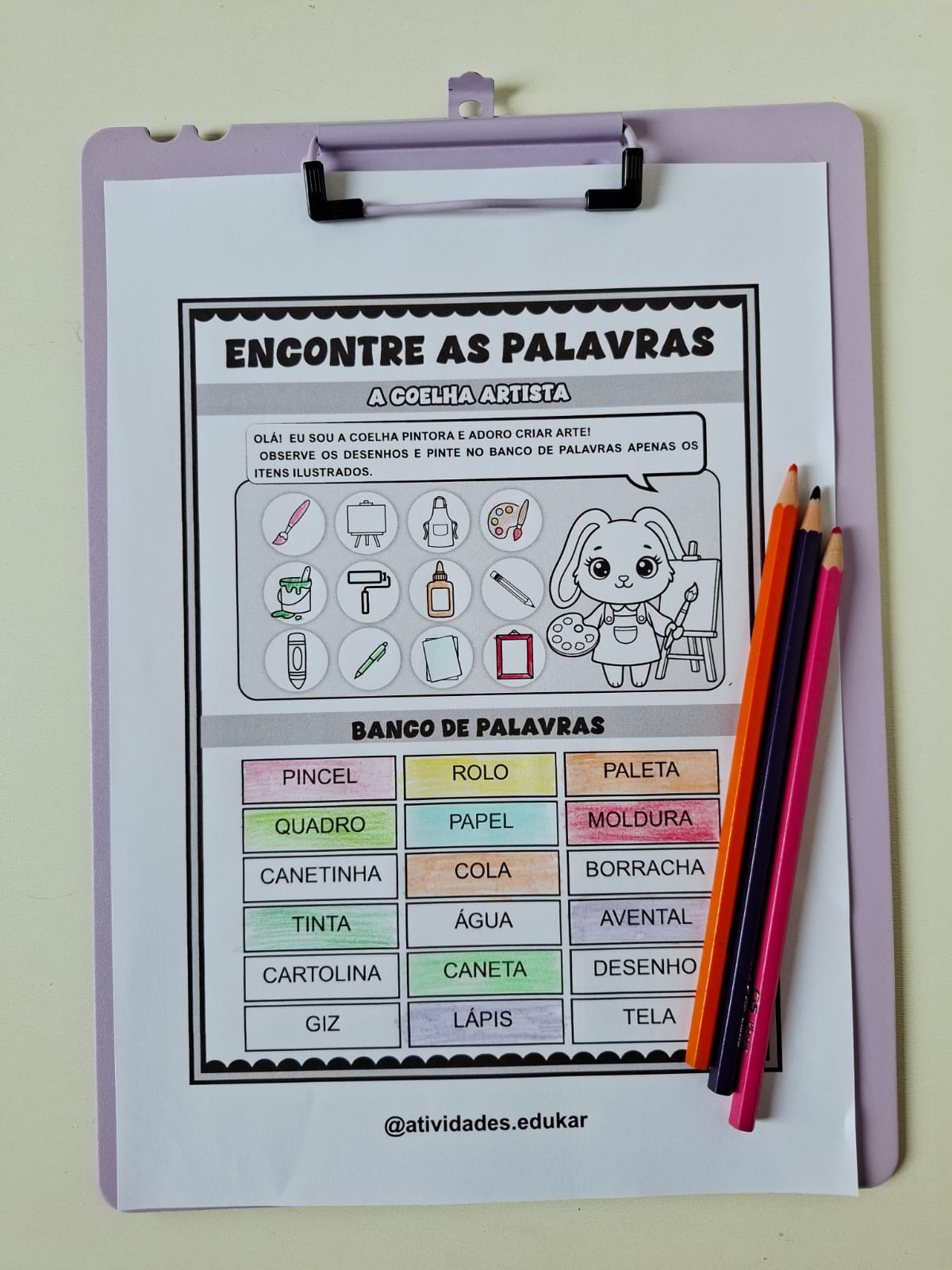 A proposta consiste em observar as ilustrações, e então, identificar e pintar o nome delas no banco de palavras.