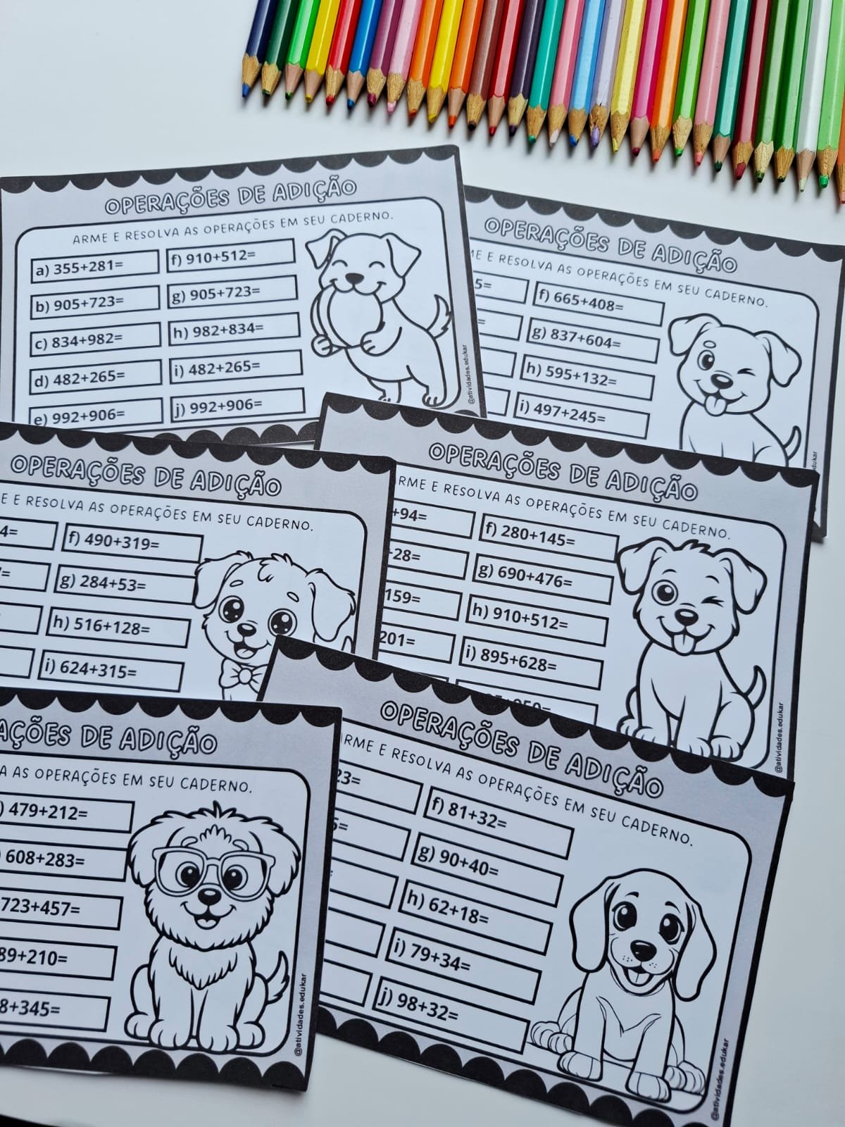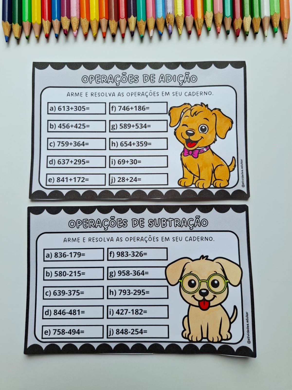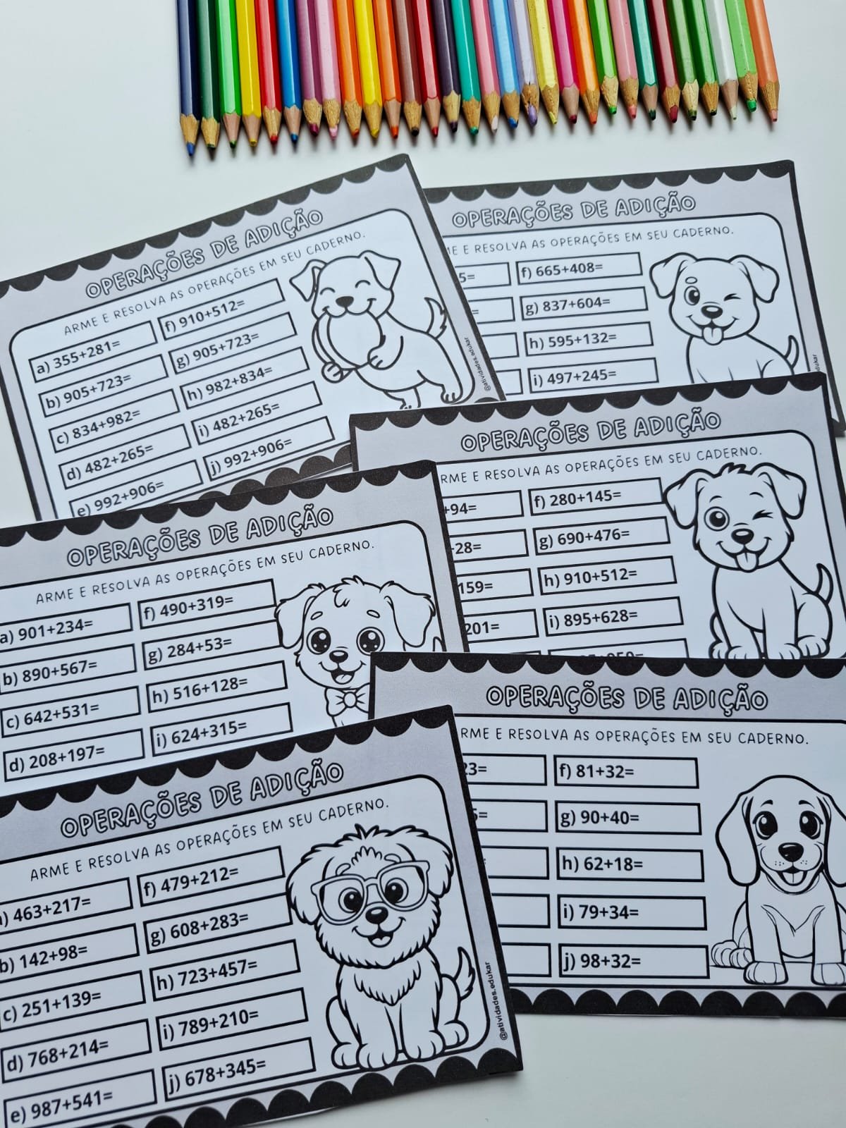 O recurso traz tiras com operações prontas para armar e resolver no caderno, acompanhadas de ilustrações de cachorrinhos, que tornam o aprendizado mais agradável e envolvente.