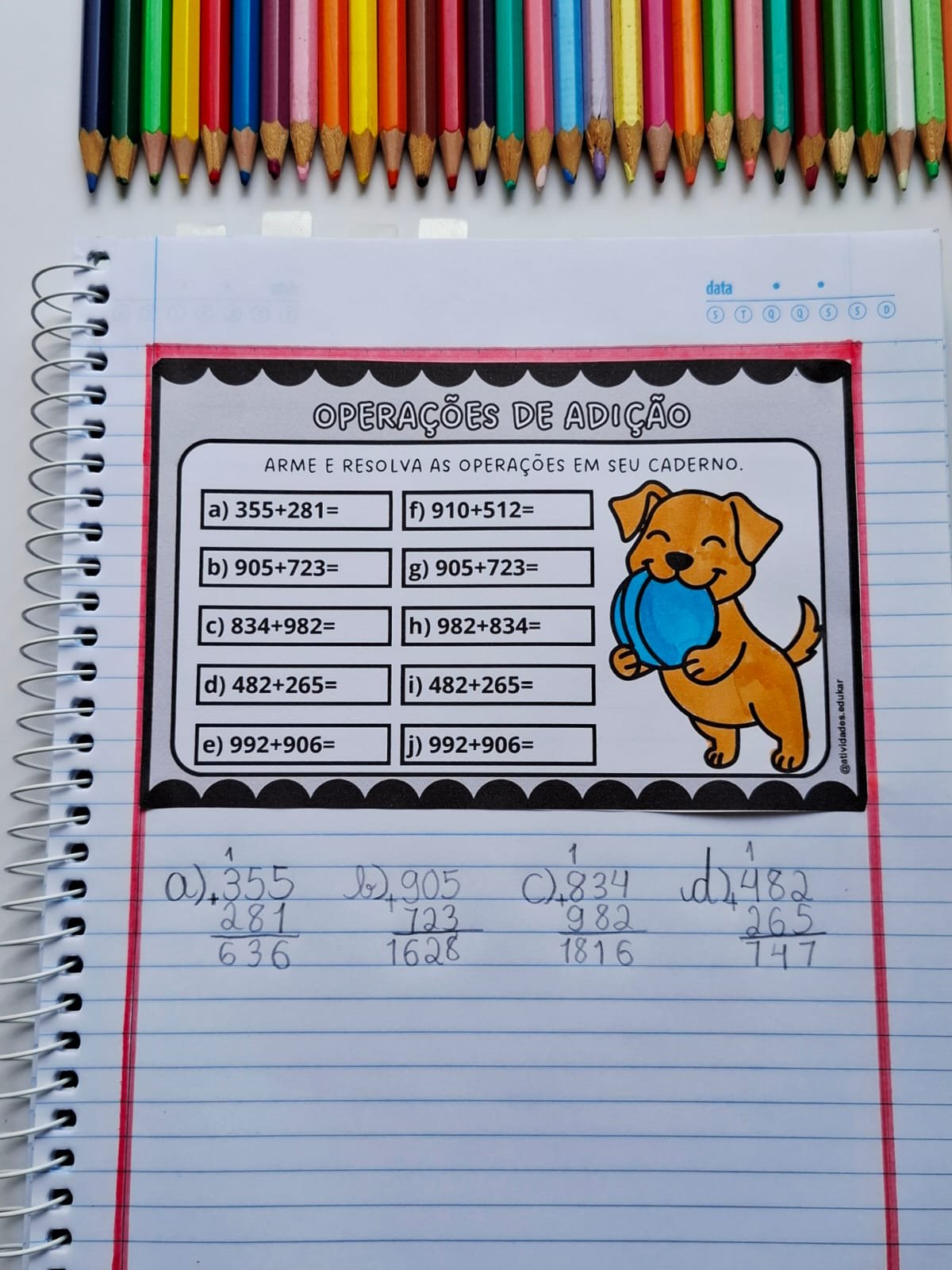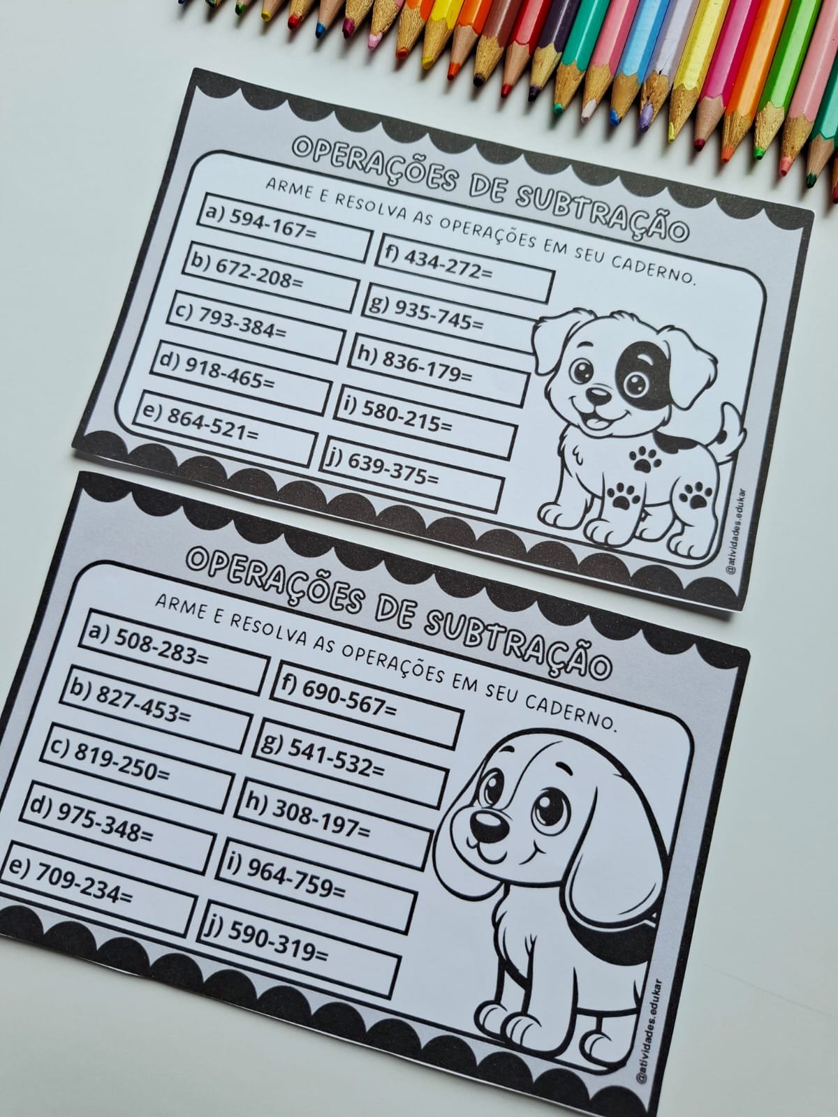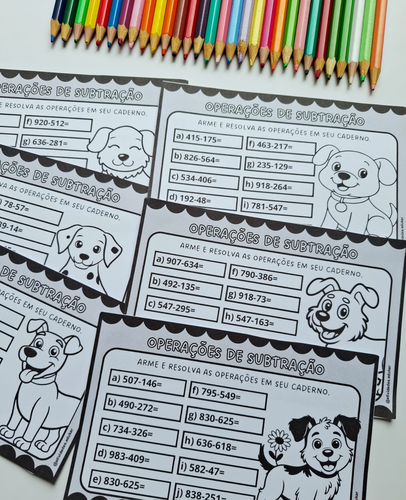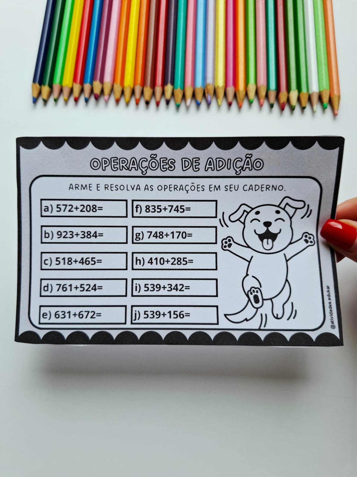 O recurso traz tiras com operações prontas para armar e resolver no caderno, acompanhadas de ilustrações de cachorrinhos, que tornam o aprendizado mais agradável e envolvente.